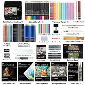 - PROFESSIONAL DRAWING KIT: Shuttle Art 124 pack drawing pencils set includes 24 colored pencils, 24 watercolor pencils, 12 metallic colored pencils, 12 graphite pencils, 12 charcoal pencils, 4 pastel pencils, 1 woodless graphite pencil, 3 charcoal sticks, 3 graphite sticks, 6 colored pastel sticks and versatile drawing tools and paper pads, perfect for creating art works with coloring, drawing, sketching and more.