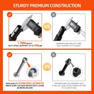 Specification: Material: 1.6mm heavy-duty steel Bearing capacity: 440 lb. Door frame standard: between 24″ and 32 Straight rod: 36.6in Curved rod:4.3in Door Anchor :17.7in Color: Black & Silver