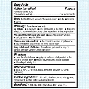 Details: Prep like the pros with infection protection you can trust. The Betadine brand has been trusted by healthcare professionals to help prevent infections for over 50 years. Povidone-iodine remains a go-to antiseptic used both in hospitals and homes for the treatment of minor cuts, scrapes, and burns as may occur from minor household accidents or bicycle falls. It remains a go-to antiseptic used both in hospitals and homes for the treatment of minor cuts, scrapes, and burns as may occur from minor household accidents or bicycle falls. Betadine Antiseptic Solution is convenient and is perfect for on-the go infection protection. Betadine works on a broad range of germs and microbes that can that can cause infections. Apply to minor cuts, scrapes, and burns to promptly kill germs and help stop infections before they start. Betadine Antiseptic Solution comes with a “No-Sting Promise” and does not contain alcohol or hydrogen peroxide. Betadine is formulated with gentleness in mind and can be used on the whole family. Use as directed.