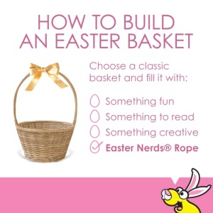 • GET ROPED IN: One of your favorite holidays and NERDS Rope come together for yummy, crunchy, gummy candy fun! This NERDS Easter candy has a chewy sweet candy center coated with tiny, tangy NERDS. The perfect mixture of tart and sweet, one bite is never enough.