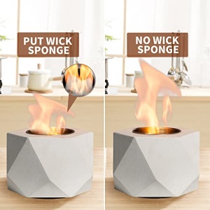 - 🔥DURABLE: This table top fire pit is made of high-quality concrete, a natural and safe material, with specially thickened bowl walls. Smokeless, odorless and durable when used. There are also two stainless steel burner cups to ensure no fuel leaks and reduce heat dissipation. The Ceramic Wool Wick Sponge attached to the package can gather the flame to make the flame more stable and safe when burning, and it can also prevent the alcohol from volatilizing and prolong the burning time.